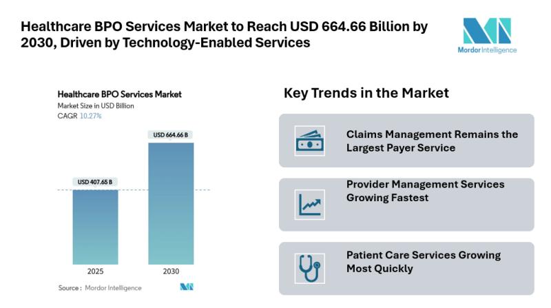 Mordor Intelligence has published a new report on the "Healthcare BPO Services Market" offering a comprehensive analysis of trends, growth drivers, and future projectionThe Healthcare Business Process Outsourcing (BPO) Services Market is projected to grow from approximately USD 407.65 billion in 2025 to USD 664.66 billion by 2030, reflecting a compound annual growth rate (CAGR) of 10.27%. This rapid expansion is driven by pressure to reduce administrative costs, ongoing labor shortages in health systems, and the progression from basic labor outsourcing toward integrated, technology-enabled service platforms that address both clinical and administrative inefficiencies. These platforms include digital claims adjudication, provider data management, and patient engagement systems-empowering payers and healthcare institutions to streamline operations and enhance outcomes.