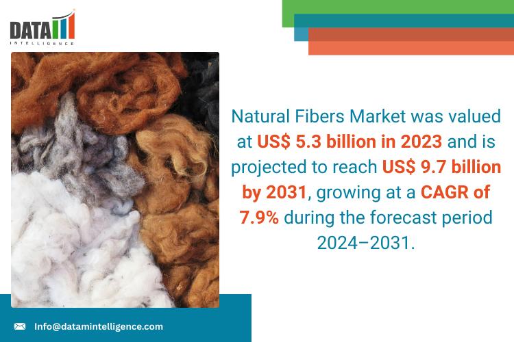 The Natural Fibers Market was valued at US$ 5.3 billion in 2023 and is projected to reach US$ 9.7 billion by 2031, growing at a CAGR of 7.9% during the forecast period 2024-2031.The Natural Fibers Market report by DataM Intelligence provides comprehensive insights and analysis on key market trends, growth opportunities, and emerging challenges. With a commitment to delivering actionable intelligence, DataM Intelligence empowers businesses to make informed decisions and stay ahead of the competition. By combining qualitative and quantitative research methodologies, the firm delivers in-depth reports that help clients navigate complex market dynamics, drive strategic growth, and seize new opportunities in an ever-evolving global landscape.