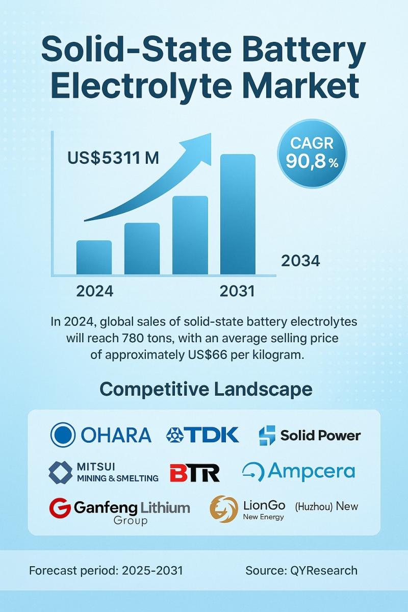 Los Angeles, United States - QY Research has unveiled its latest study titled "Global Solid-State Battery Electrolyte Market Share and Ranking, Overall Sales and Demand Forecast 2025-2031." This newly released report delivers a comprehensive overview of the global Solid-State Battery Electrolyte market, analyzing the forces shaping its growth trajectory and providing valuable insights for stakeholders, investors, and industry professionals. the research covers key areas including market dynamics, segmentation, regional performance,…