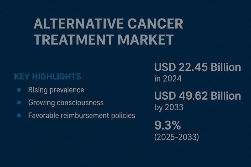 Alternative Cancer Treatment Market reached US$ 22.45 billion in 2024 and is expected to reach US$ 49.62 billion by 2033, growing at a CAGR of 9.3% during the forecast period 2025-2033.Alternative Cancer Treatment Market report, published by DataM Intelligence, provides in-depth insights and analysis on key market trends, growth opportunities, and emerging challenges. Committed to delivering actionable intelligence, DataM Intelligence empowers businesses to make informed decisions and stay ahead of the competition. Through a combination of qualitative and quantitative research methods, it offers comprehensive reports that help clients navigate complex market landscapes, drive strategic growth, and seize new opportunities in an ever-evolving global market.