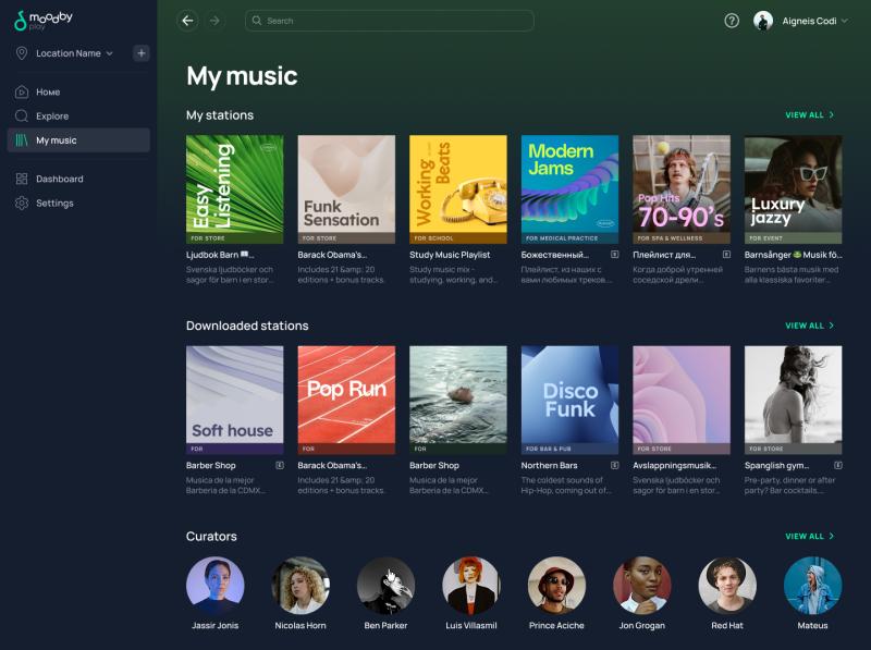 The platform's music engineers create custom playlists based on client requests and playlist updates driven by client requests and listening analytics from the most popular stations. Businesses simply select the atmosphere that matches their brand, genre preference, or context, then let the music play.