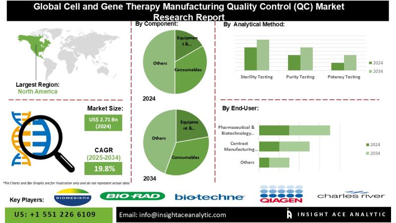 InsightAce Analytic Pvt. Ltd. announces the release of a market assessment report on the "Global Cell and Gene Therapy Manufacturing Quality Control (QC) Market - (By Component (Equipment & Accessories, Consumables, Others), By Application (Sterility Testing, Purity Testing, Potency Testing, Identity Testing, Others (stability, viability, etc.)), By Process (Upstream Processing, Downstream Processing, Packaging), By End-User (Pharmaceutical & Biotechnology Companies, Contract Manufacturing Organizations)), Trends, Industry Competition Analysis, Revenue and Forecast To…
