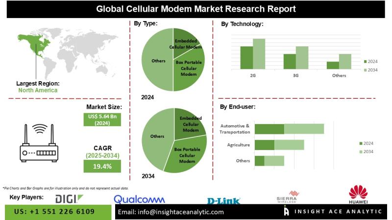 InsightAce Analytic Pvt. Ltd. announces the release of a market assessment report on the "Global Cellular Modem Market - (By Type (Embedded Cellular Modem, Box Portable Cellular Modem), By Technology (2G, 3G, 4G, 5G, LPWAN (NB-IoT, LTE-M)), By Vertical (Agriculture, Automotive & Transportation, Consumer Electronics, Building Automation, Energy & Utilities, Smart Cities, Healthcare, Industrial/Manufacturing, Retail, Others)), Trends, Industry Competition Analysis, Revenue and Forecast To 2034."