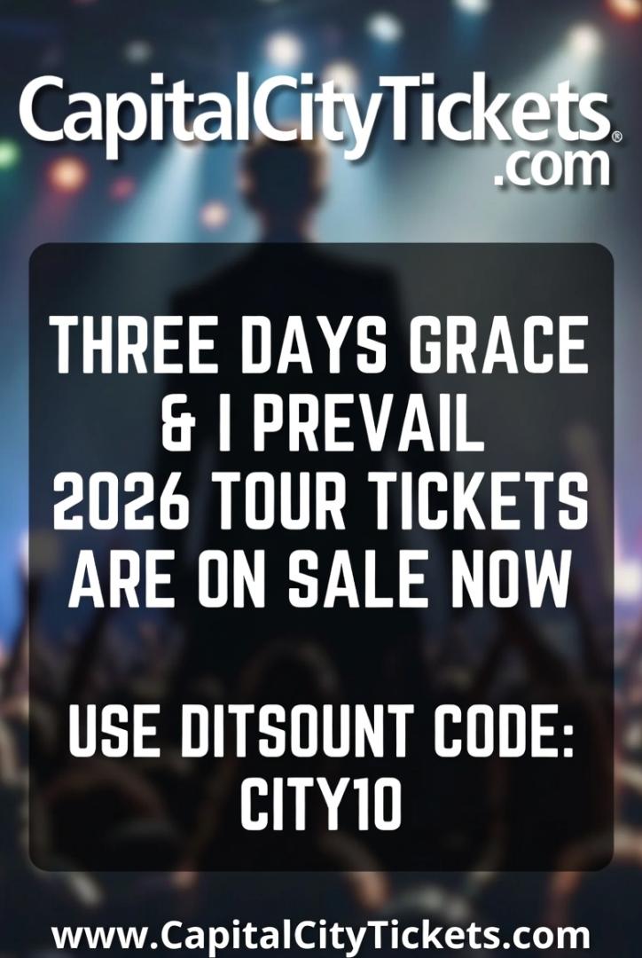 Get the best deals on Three Days Grace 2026 concert tickets with special guest I Prevail! Use promo code CITY10 at CapitalCityTickets.com for instant discounts, top seats, and exclusive offers. Check full tour dates, secure your tickets early, and don't miss this high-energy live rock experience-grab your tickets now for an unforgettable night of music and excitement.