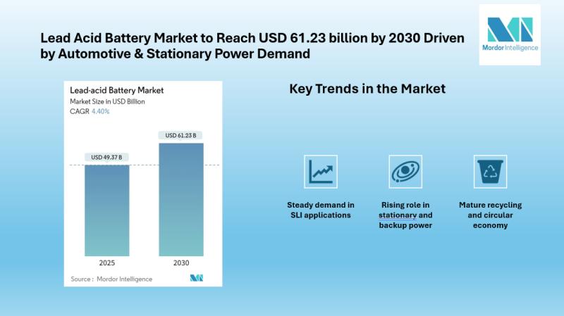 The global Lead Acid Battery Market is on track for steady growth in the coming years. According to Mordor Intelligence, the market is projected to reach USD 61.23 billion by 2030, expanding from its 2025 estimate of USD 49.37 billion at a compound annual growth rate (CAGR) of 4.40 % over the forecast period.