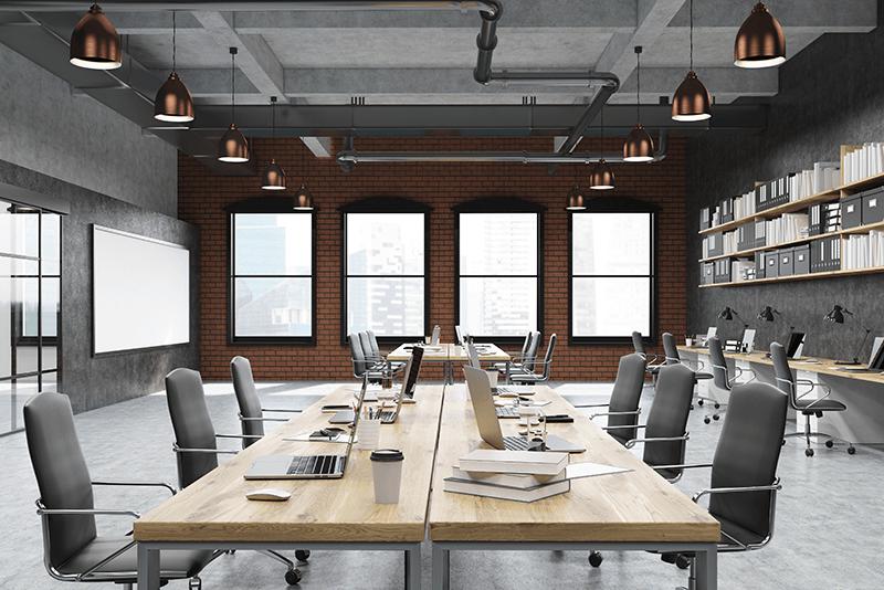 The quintessential workplace with an industrial-look has one or more of the following characteristics: