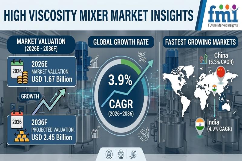 According to the latest analysis by Future Market Insights (FMI), the global high viscosity mixer market is entering a new phase of transformation, shifting from a supply-driven commodity cycle to a specification-led procurement ecosystem. The market is projected to grow from USD 1.67 billion in 2026 to USD 2.45 billion by 2036, reflecting a steady CAGR of 3.9%.