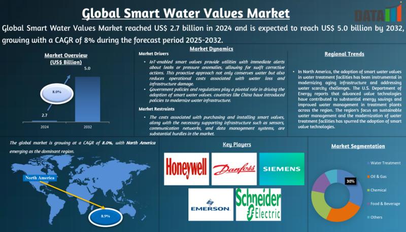 Global Smart Water Valves Market reached US$ 2.7 billion in 2024 and is expected to reach US$ 5.0 billion by 2032, growing with a CAGR of 8% during the forecast period 2025-2032, according to DataM intelligence research.