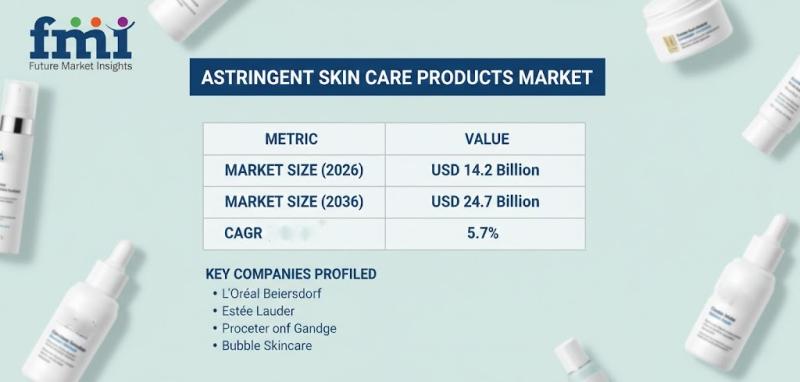 The global astringent skin care products market is set for sustained expansion over the next decade, growing from USD 14.2 billion in 2026 to USD 24.7 billion by 2036, registering a CAGR of 5.7%. According to the latest analysis by Future Market Insights (FMI), the market surpassed USD 13.4 billion in 2025 as retailers and R&D leaders accelerated the shift from traditional alcohol-based toners toward barrier-supportive, "clean clinical" astringent solutions.