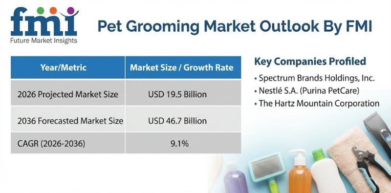 The global pet grooming market is projected to expand from USD 19.5 billion in 2026 to USD 46.7 billion by 2036, registering a CAGR of 9.1% over the forecast period, according to the latest analysis by Future Market Insights (FMI). Growth is fueled by rising companion animal ownership, increasing pet humanization, and higher recurring spending on hygiene, coat care, and wellness-focused grooming services for dogs and cats.