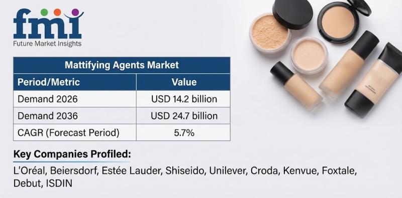 The global mattifying agents market is projected to grow steadily over the next decade, expanding from USD 14.2 billion in 2026 to USD 24.7 billion by 2036, registering a CAGR of 5.7%. According to the latest analysis by Future Market Insights (FMI), growth is being driven by the transition from aesthetic oil masking to therapeutic sebum regulation, alongside tightening global cosmetic regulations that favor science-backed ingredient suppliers.