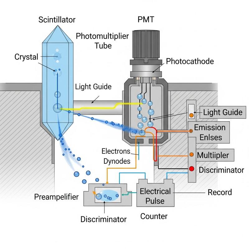 Scintillation Counters are radiation detection devices that measure and analyze ionizing radiation by using a scintillating material to convert radiation into light, which is then detected by a photomultiplier tube or photodiode. They are widely used in nuclear medicine, environmental monitoring, high-energy physics, and industrial applications to detect alpha, beta, and gamma radiation with high sensitivity and accuracy. Scintillation counters play a crucial role in research, safety, and diagnostic fields.