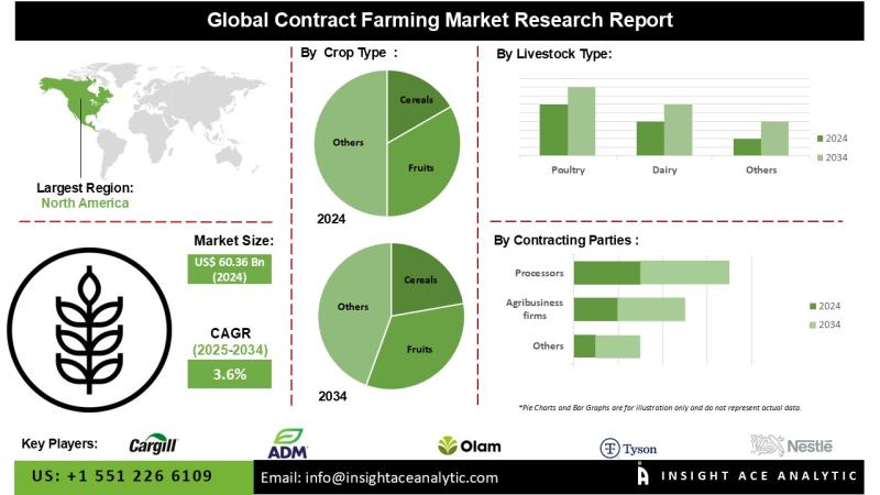 InsightAce Analytic Pvt. Ltd. announces the release of a market assessment report on the "Global Contract Farming Market- (By Crop Type (Cereals (e.g., wheat, rice, maize), Fruits, Vegetables, Oilseeds, Pulses, Others), By Livestock Type (Poultry, Dairy, Swine, Cattle, Aquaculture, Others, By Contracting Parties (Agribusiness firms, Processors, Cooperatives, Exporters, Retailers, Others)), Trends, Industry Competition Analysis, Revenue and Forecast To 2034."