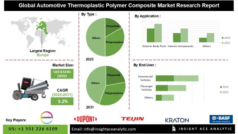 InsightAce Analytic Pvt. Ltd. announces the release of a market assessment report on the "Global Automotive Thermoplastic Polymer Composite Market Size, Share & Trends Analysis Report By Application (Exterior Body Parts, Interior Components, Structural Components, Automated Parts, Under-the-Hood Applications), Type (Polyamide, Polypropylene, Polycarbonate, Acrylonitrile Butadiene Styrene, Thermoplastic Polyurethane), End User (Passenger Vehicles, Commercial Vehicles, Electric Vehicles, Hybrid Vehicles, Luxury Vehicles), Manufacturing Process (Injection Molding, Compression Molding, Blow Molding, Thermoforming, 3D…