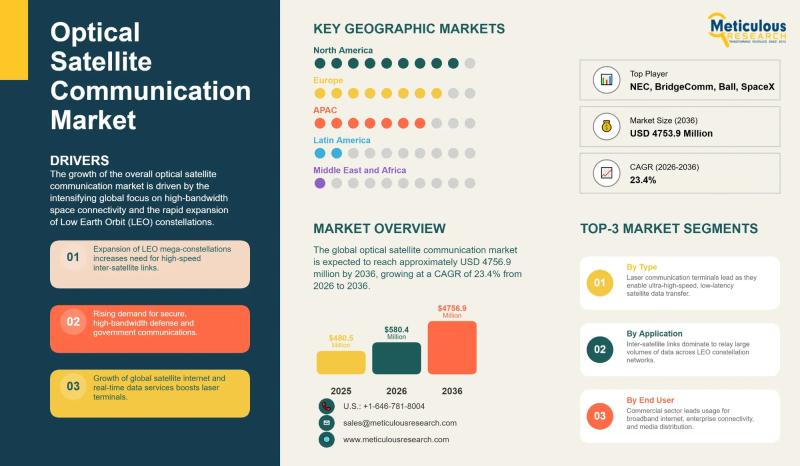 The global optical satellite communication market is growing at a pace that reflects just how urgently the space industry needs a better way to move data. Valued at USD 480.5 million in 2025, the market is projected to expand from USD 580.4 million in 2026 to approximately USD 4.76 billion by 2036 - a compound annual growth rate of 23.4%. That's nearly a tenfold increase in a single decade, driven…