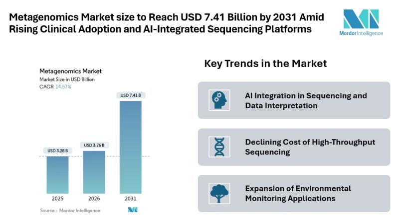 According to Mordor Intelligence, the metagenomics market size [https://www.mordorintelligence.com/industry-reports/metagenomics-market?utm_source=abnewswire] is projected to grow from USD 3.28 billion in 2025 to USD 3.76 billion in 2026, reaching USD 7.41 billion by 2031, at a CAGR of 14.57% during the forecast period. The rising use of artificial intelligence in…