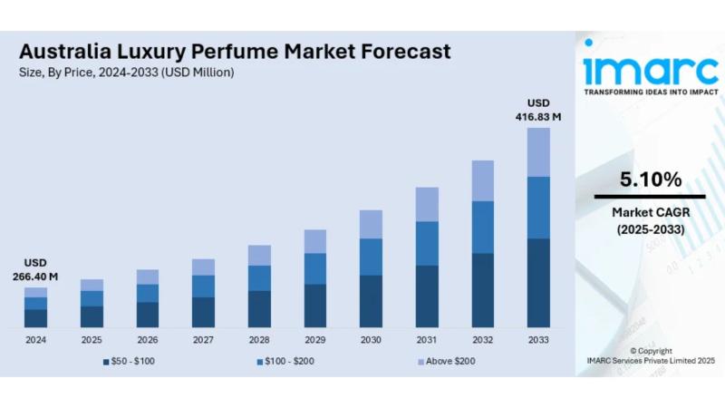 According to IMARC Group's latest research publication, "Australia Luxury Perfume Market: Industry Trends, Share, Size, Growth, Opportunity and Forecast 2025-2033", The Australia luxury perfume market size reached USD 266.40 Million in 2024. Looking forward, IMARC Group expects the market to reach USD 416.83 Million by 2033, exhibiting a growth rate (CAGR) of 5.10% during 2025-2033.