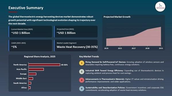 Thermoelectric Energy Harvesting Devices Market to Reach USD 1.1 Billion by 2035, Fueled by IoT, Wearables and Waste-Heat Recovery