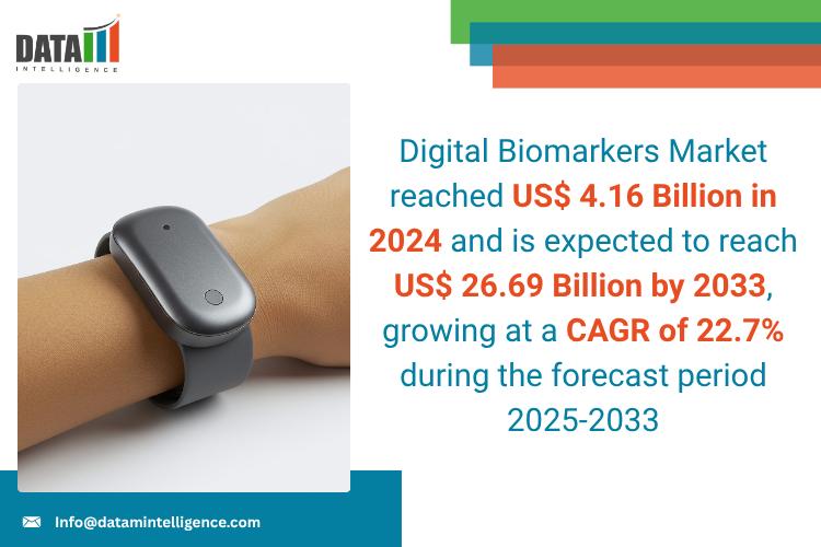 Digital Biomarkers Market reached US$ 4.16 Billion in 2024 and is expected to reach US$ 26.69 Billion by 2033, growing at a CAGR of 22.7% during the forecast period 2025-2033