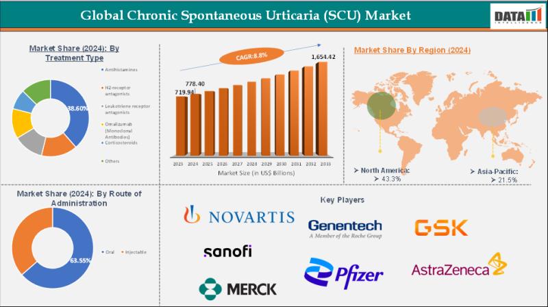 The Global Chronic Spontaneous Urticaria (SCU) Treatment Market reached US$ 719.94 Million in 2023, with a rise of US$ 778.40 Million in 2024 and is expected to reach US1,654.42 Million by 2033, growing at a CAGR of 8.8% during the forecast period 2025-2033.