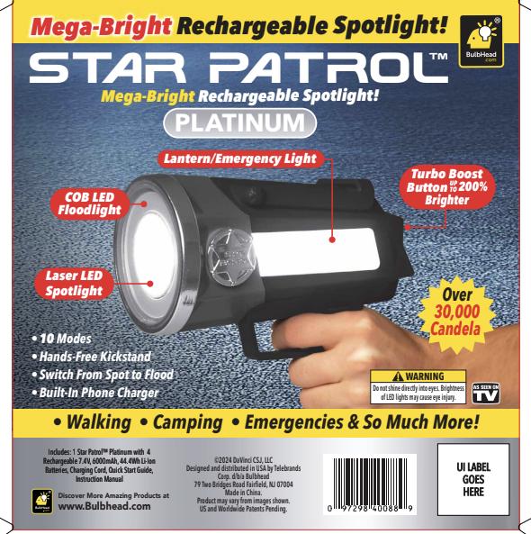 The Star Patrol Mega-Bright Rechargeable Spotlight is a high-performance lighting device engineered to provide superior brightness, long-lasting power, and unmatched versatility for both indoor and outdoor use. It's designed by BulbHead, a trusted name in innovative home and outdoor products, and built for people who need a powerful, reliable, and easy-to-use source of illumination.