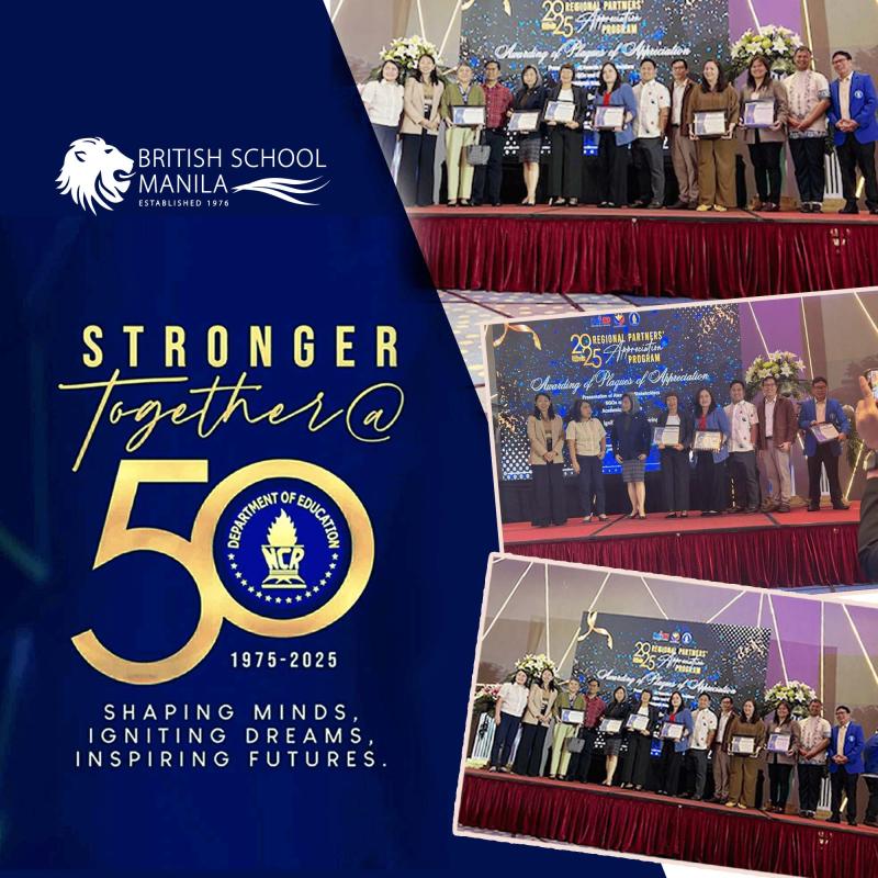 The British School Manila (BSM) is deeply pleased and humbled to have been recognized by the Department of Education National Capital Region (DepEd NCR) during its Regional Partners' Appreciation Program held on October 1, 2025 at the Luxent Hotel, Quezon City.The Appreciation Night was one of the events being held to celebrate DepEd NCR's 50th Founding Anniversary, with the theme: "Shaping Minds, Igniting Dreams, Inspiring Futures."
