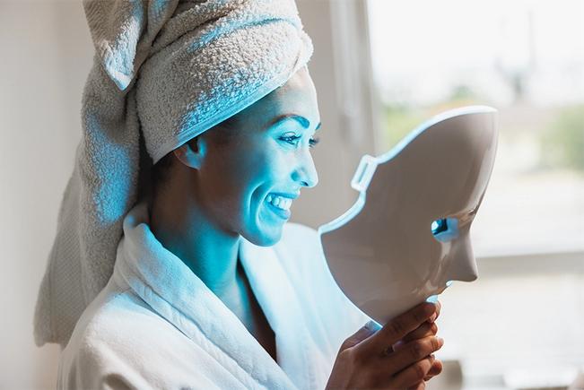 Blue Light targets acne causing bacteria and helps calm breakouts.