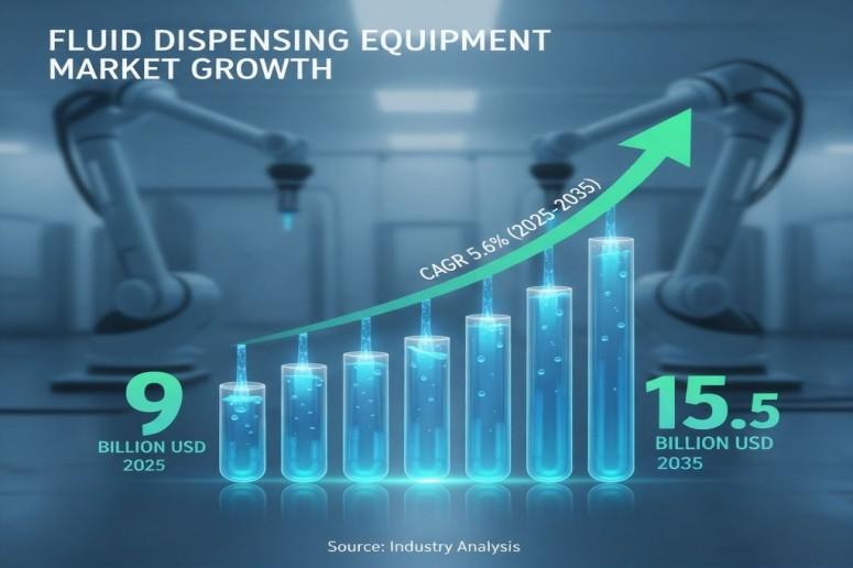 The global Fluid Dispensing Equipment Market is set for a period of high-momentum expansion, driven by the escalating demand for precision in advanced manufacturing, according to a new market analysis. The market, valued at USD 9 billion in 2025, is projected to surge to USD 15.5 billion by 2035, exhibiting a robust Compound Annual Growth Rate (CAGR) of 5.6% over the forecast period.The study emphasizes that the market's growth trajectory is distinctly non-linear, with acceleration intensifying in the later half of the decade. While the market is expected to rise from USD 9 billion to approximately USD 11.2 billion between 2025 and 2030, the climb is expected to steepen significantly, adding another USD 4.3 billion to reach the USD 15.5 billion forecast by 2035. This pattern underscores a shift from steady adoption to a phase of intensified capital investment in automation and high-precision systems across key industrial sectors.