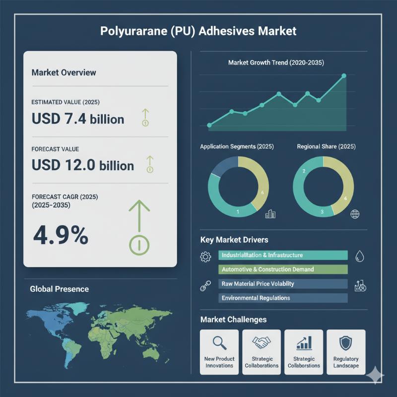 The global Polyurethane (PU) Adhesives market is witnessing a significant upturn, with key industries like automotive, construction, and packaging driving the demand for high-performance bonding solutions. According to a new market research report, the PU adhesives market is set to reach a valuation of USD 7.4 billion in 2025 and is forecasted to grow to USD 12.0 billion by 2035, registering a compound annual growth rate (CAGR) of 4.9% during the forecast period. This report provides stakeholders with a comprehensive analysis of key market drivers, trends, opportunities, and competitive dynamics shaping the future of the PU adhesives market.Find Out More-Read the Complete Report for Full Insights!
