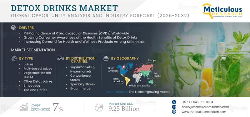 The global detox drinks market has witnessed impressive growth in recent years as consumers increasingly prioritize health, wellness, and natural nutrition. Valued at USD 5.40 billion in 2024, the market is projected to reach USD 9.25 billion by 2032, growing at a CAGR of 7% from 2025 to 2032. The expansion of this market is primarily driven by the growing awareness of detoxification benefits, rising incidences of cardiovascular diseases, and a surge in demand for organic, plant-based beverages among health-conscious consumers.Download Sample Report Here : https://www.meticulousresearch.com/download-sample-report/cp_id=6123
