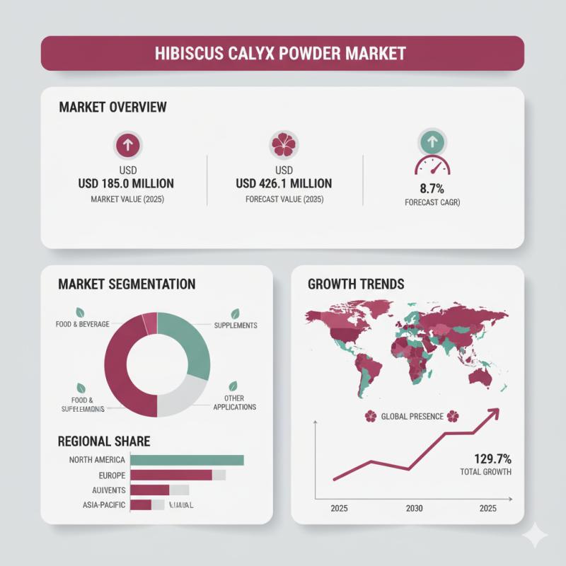 The global hibiscus calyx powder market is projected to grow from USD 185.0 million in 2025 to approximately USD 426.1 million by 2035, recording an absolute increase of USD 240.0 million over the forecast period. This translates into a total growth of 129.7%, with the market forecast to expand at a compound annual growth rate (CAGR) of 8.7% between 2025 and 2035.