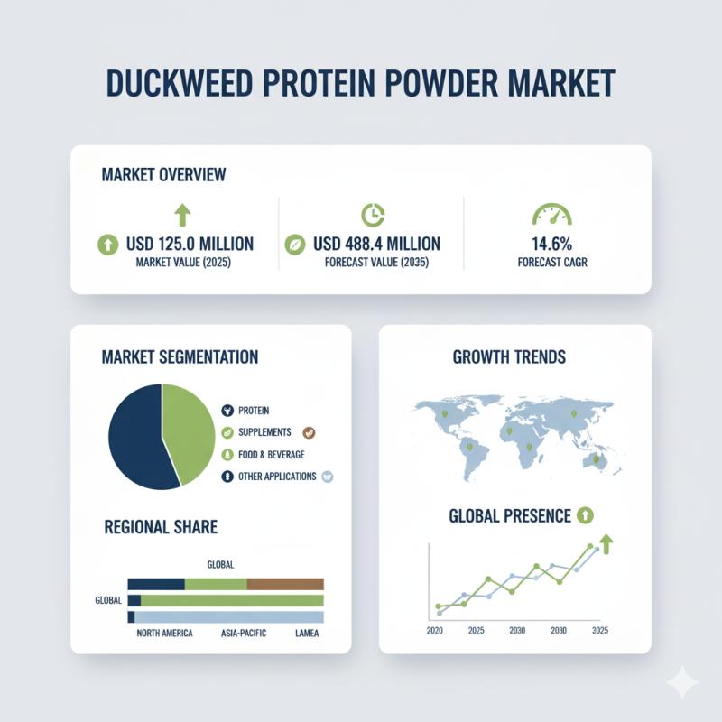 The global duckweed protein powder market is projected to grow from USD 125.0 million in 2025 to approximately USD 488.4 million by 2035, recording an absolute increase of USD 360.0 million over the forecast period. This translates into a total growth of 288.0%, with the market forecast to expand at a compound annual growth rate (CAGR) of 14.6% between 2025 and 2035.The overall market size is expected to grow by nearly 3.88X during the same period, supported by increasing demand for sustainable protein sources, growing awareness about environmental benefits of duckweed cultivation, rising adoption in animal feed industries, and expanding applications in human nutrition and aquaculture sectors.