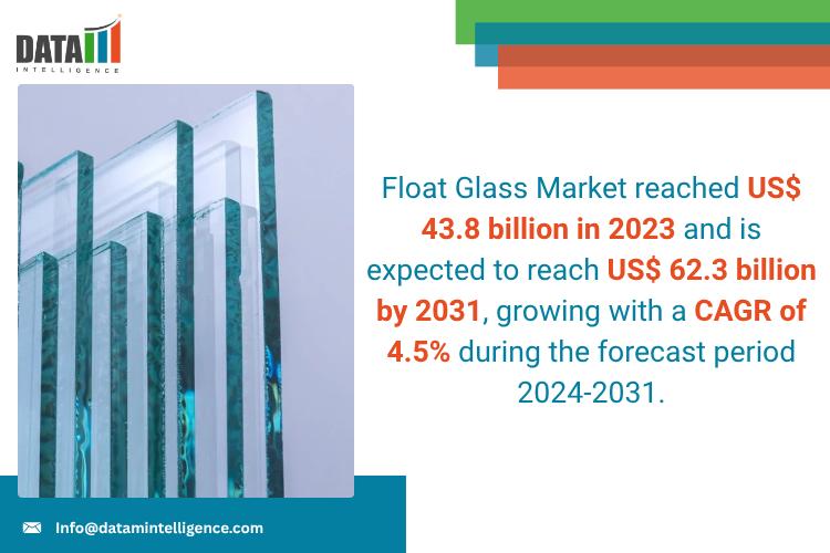 Float Glass Market reached US$ 43.8 billion in 2023 and is expected to reach US$ 62.3 billion by 2031, growing with a CAGR of 4.5% during the forecast period 2024-2031.