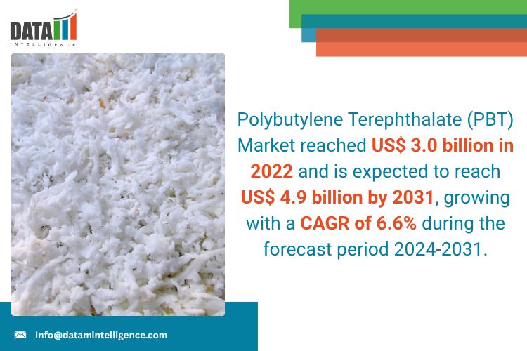 Polybutylene Terephthalate (PBT) Market reached US$ 3.0 billion in 2022 and is expected to reach US$ 4.9 billion by 2031, growing with a CAGR of 6.6% during the forecast period 2024-2031.