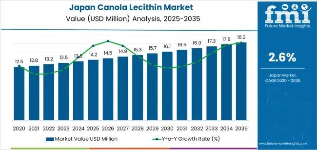 Japan's canola lecithin market is entering a phase of steady expansion, supported by rising consumer demand for natural, clean-label emulsifiers and the growing use of plant-based ingredients across food, pharmaceutical, and cosmetics applications. Market projections show demand increasing from USD 14.2 million in 2025 to USD 18.2 million by 2035, driven by a shift toward healthier formulations and sustained growth in processed food and nutraceutical categories.