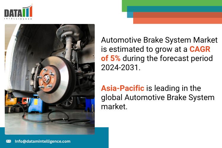 Automotive Brake System Market is estimated to grow at a CAGR of 5% during the forecast period 2024-2031.DataM Intelligence unveils its latest report on the "Automotive Brake System Market Size 2025," offering an in-depth analysis of market trends, growth drivers, competitive landscape, and regional dynamics. The study covers market size in value and volume, CAGR forecasts, and emerging opportunities that can guide businesses in seizing growth potential and crafting winning strategies. Packed with data-driven insights on current developments and future trends, this report is essential for companies aiming to stay ahead in the competitive Market.