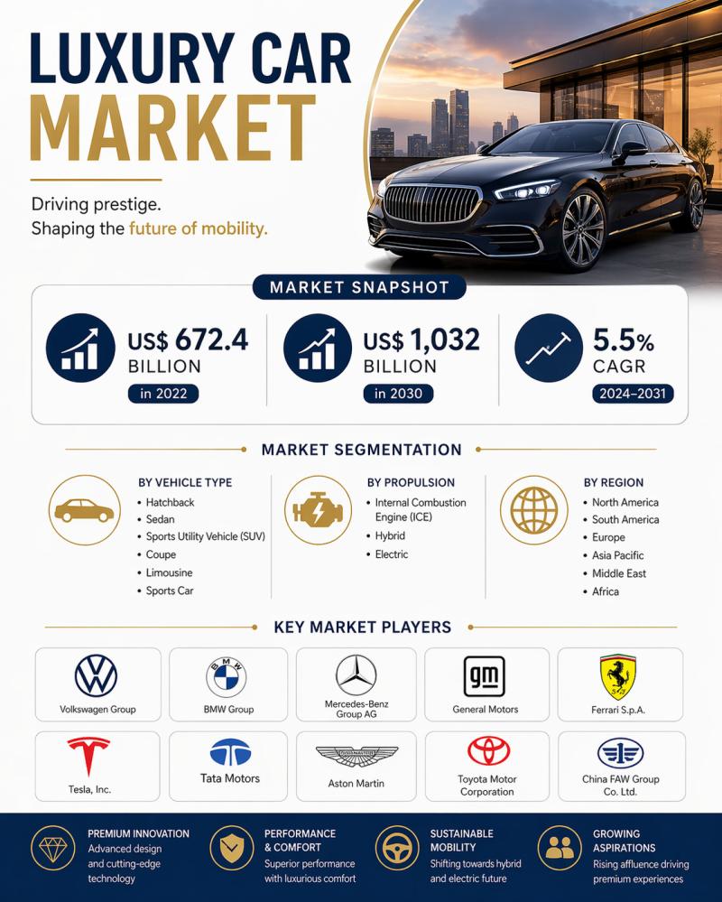 DataM Intelligence has released a new research report titled "Luxury Car Market Size 2026" The report delivers in-depth insights into key market dynamics, including regional growth trends, market segmentation, CAGR projections, and the revenue performance of leading industry players. It also highlights major growth drivers shaping the market landscape. Designed to provide a clear and comprehensive perspective, the report offers a detailed view of the current market size in terms…