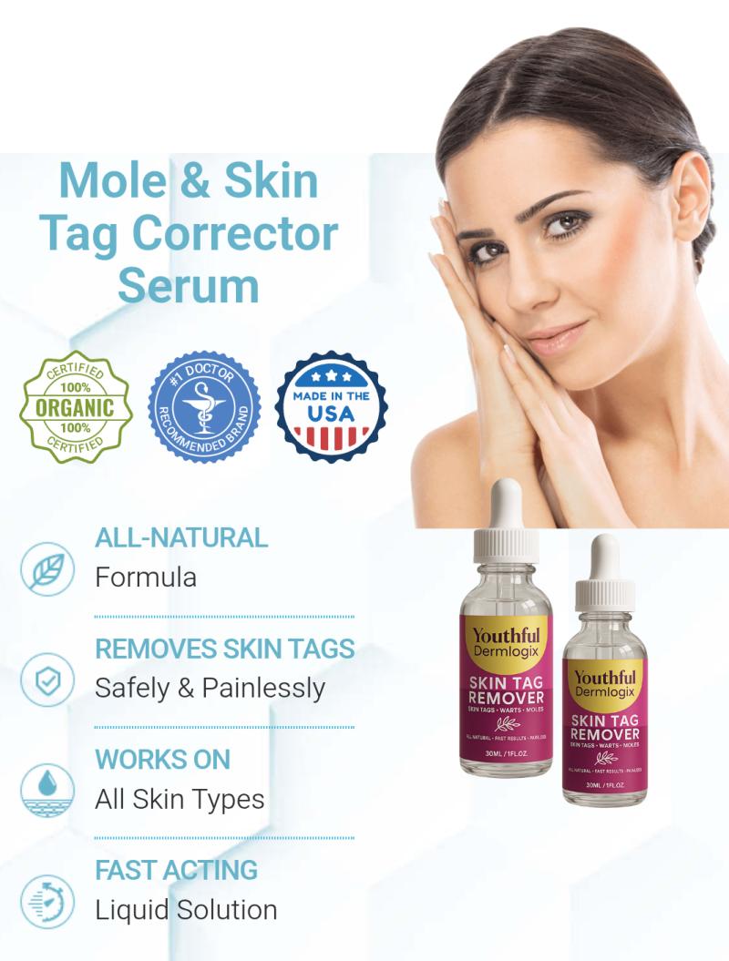 Youthful Dermlogix Skin Tag Removal is a revolutionary, all-natural serum specifically formulated to eliminate unwanted skin growths safely, quickly, and effectively. Recognized as the best skin tag remover in the USA and the top-rated solution for clear, healthy skin, it targets a variety of common skin blemishes-including skin tags, dark moles, light moles, small warts, and big warts. The advanced formula works deep within the skin to dissolve these imperfections from the root, rather than just masking their appearance. By stimulating the body's natural immune response, Youthful Dermlogix helps remove these growths permanently while promoting smooth, blemish-free skin without scars or irritation.