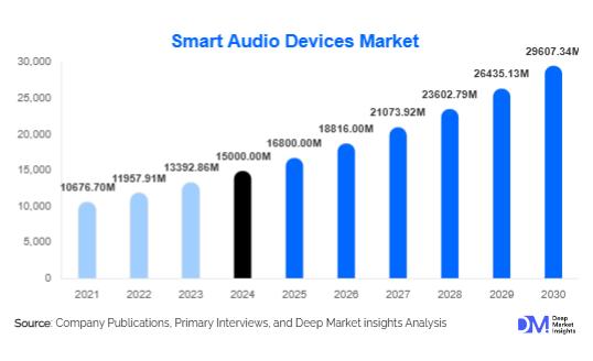 Smart audio devices are evolving into key components of connected lifestyles, offering seamless voice interaction, immersive sound, and AI-driven functionalities.According to Deep Market Insights, the global smart audio devices market size was valued at USD 15,000 million in 2024 and is projected to grow from USD 16,800 million in 2025 to reach USD 29,607.34 million by 2030, expanding at a CAGR of 12% during the forecast period (2025-2030). This growth is driven by increasing demand for wireless entertainment, rising adoption of smart home ecosystems, and the expansion of in-vehicle infotainment systems.