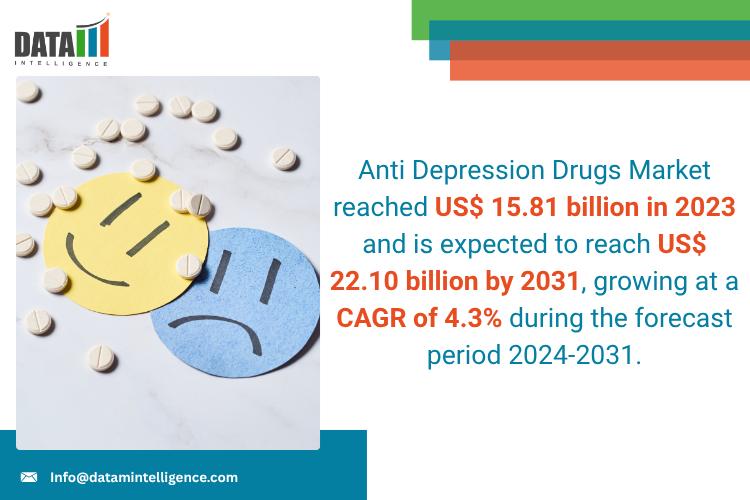 Anti Depression Drugs Market reached US$ 15.81 billion in 2023 and is expected to reach US$ 22.10 billion by 2031, growing at a CAGR of 4.3% during the forecast period 2024-2031.DataM Intelligence unveils its latest report on the "Anti Depression Drugs Market Size 2025," offering an in-depth analysis of market trends, growth drivers, competitive landscape, and regional dynamics. The study covers market size in value and volume, CAGR forecasts, and emerging opportunities that can guide businesses in seizing growth potential and crafting winning strategies. Packed with data-driven insights on current developments and future trends, this report is essential for companies aiming to stay ahead in the competitive Market.