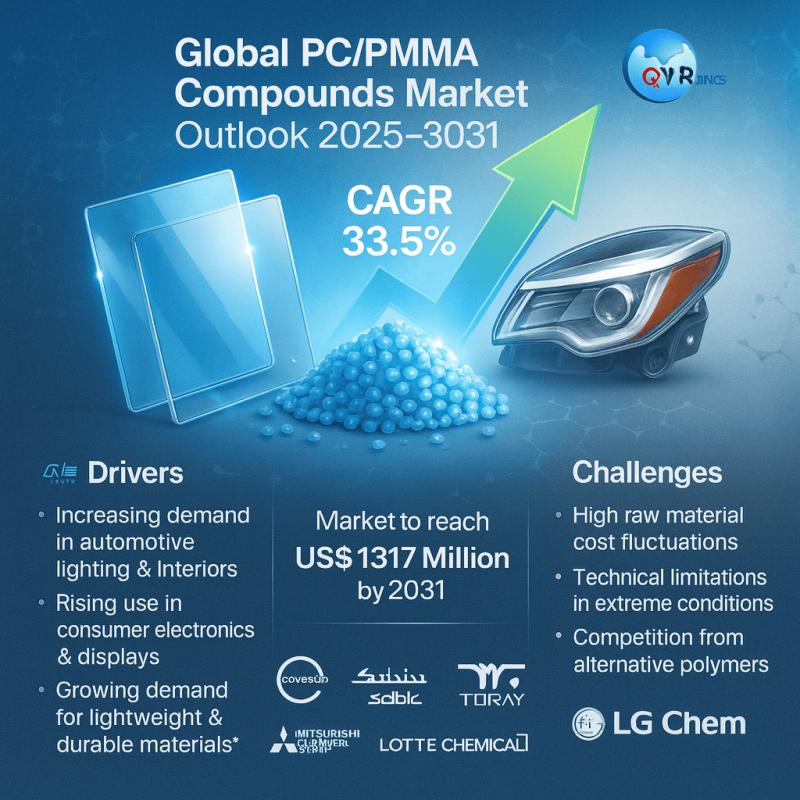 Los Angeles, United States - According to the latest market research study published by QY Research, the Global PC/PMMA Compounds Market is poised for substantial growth over the forecast period 2025-2031. Valued at USD 172 million in 2024, the market is projected to reach USD 1317 million by 2031, expanding at a CAGR of 33.5%.This anticipated expansion is attributed to rising adoption across multiple industries, technological innovation, evolving consumer preferences, and strong demand in emerging economies. The study provides a comprehensive analysis of key drivers, growth trends, competitive dynamics, opportunities, and challenges shaping the future of the market.
