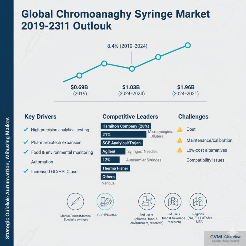 [Chicago, 08 October 2025] - Clearview Market Insights (CVMI) predicts that the global chromatography syringe market will increase from USD 1.03 billion in 2024 to USD 1.96 billion by 2031, with a CAGR of 9.5%. The rising demand is due to growing pharmaceutical research, food safety testing, and environmental monitoring."Chromatography syringes are the backbone of precise analytical testing, ensuring accuracy and reliability in industries where quality matters most," said Dr. Alan Peterson, senior laboratory technologies analyst at CVMI.