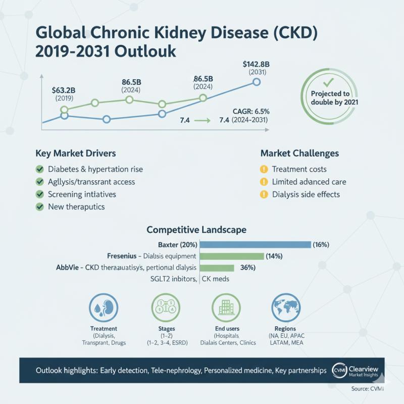 [New York, 08 October 2025] - Clearview Market Insights (CVMI) forecasts that the global CKD market will grow from USD 86.5 billion in 2024 to USD 142.8 billion by 2031, at a CAGR of 7.4%. This increase is driven by an aging population, rising cases of diabetes and hypertension, and improved access to advanced treatments."Early detection and innovative therapeutics are transforming CKD management, offering patients better quality of life and improved survival rates," said Dr. Elena Ramirez, nephrology market analyst at CVMI.