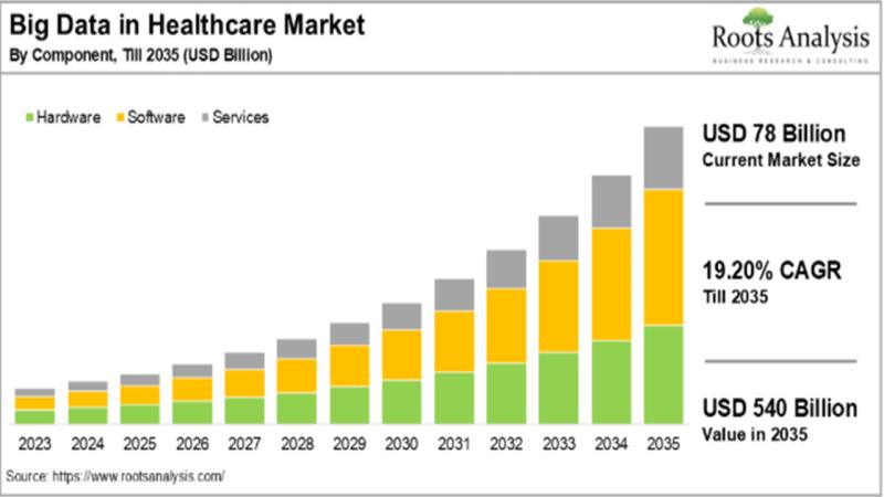 The global big data in healthcare market size is estimated to grow from USD 78 billion in 2024 to USD 540 billion by 2035, representing a CAGR of 19.20% during the forecast period till 2035. Big data in healthcare is the collection of large amounts of unstructured data from various sources, such as medical research, biometric data, electronic medical records, Internet of Medical Things (IoMT), social media, payer records, omics research, and data banks. Integrating this diverse and complex unstructured data into traditional databases poses a significant challenge in terms of data structuring and standardization, which is essential to ensure compatibility and enable effective analysis. However, recent advancements in big data analytics tools, artificial intelligence, and machine learning have revolutionized the conversion of big data in healthcare into valuable and actionable information. These technological breakthroughs have revolutionized various aspects of healthcare, enabling data-driven decision-making, improving diagnostics, facilitating personalized treatment approaches, and empowering patients with self-service options.To request quote of this report, please visit: