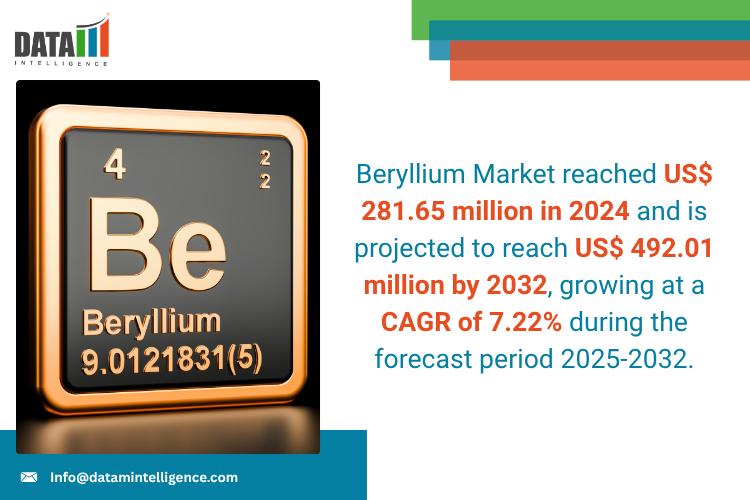 Beryllium Market reached US$ 281.65 million in 2024 and is projected to reach US$ 492.01 million by 2032, growing at a CAGR of 7.22% during the forecast period 2025-2032.