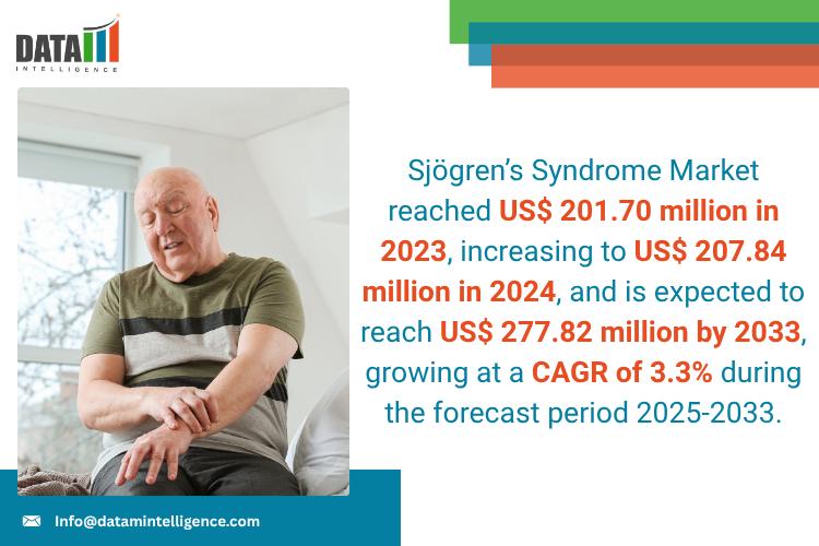 Sjögren's Syndrome Market reached US$ 201.70 million in 2023, increasing to US$ 207.84 million in 2024, and is expected to reach US$ 277.82 million by 2033, growing at a CAGR of 3.3% during the forecast period 2025-2033.