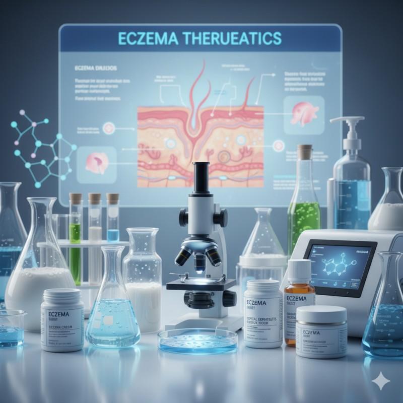 Eczema therapeutics are treatments aimed at managing and alleviating symptoms of eczema, a chronic inflammatory skin condition. They include corticosteroids, emollients, antihistamines, immunomodulators, and biologics to reduce inflammation, itching, and flare-ups while improving skin barrier function and patient quality of life.