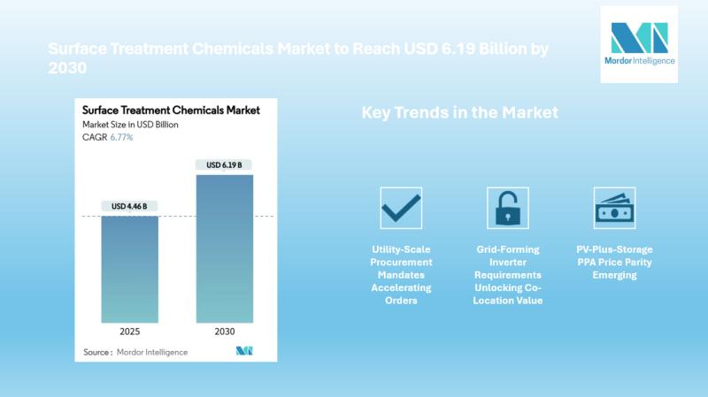 The latest research by Mordor Intelligence covers the "Surface Treatment Chemicals Market," delivering insights into market dynamics, drivers of growth, and long-term forecasts.The global Surface Treatment Chemicals Market is projected to grow from USD 4.46 billion in 2025 to USD 6.19 billion by 2030, registering a CAGR of 6.77% during the forecast period.