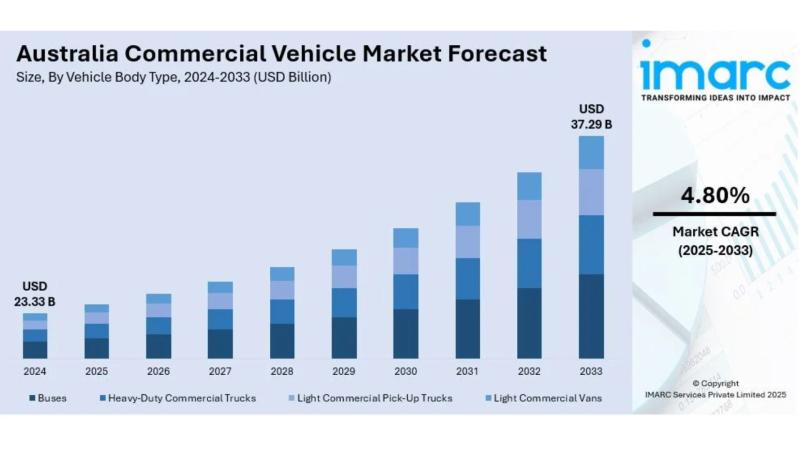 According to IMARC Group's latest research publication, "Australia Commercial Vehicle Market Size, Share, Trends and Forecast by Vehicle Body Type, Propulsion Type, and Region, 2025-2033", The Australia commercial vehicle market size was valued at USD 23.33 Billion in 2024. Looking forward, IMARC Group estimates the market to reach USD 37.29 Billion by 2033, exhibiting a CAGR of 4.80% during 2025-2033.