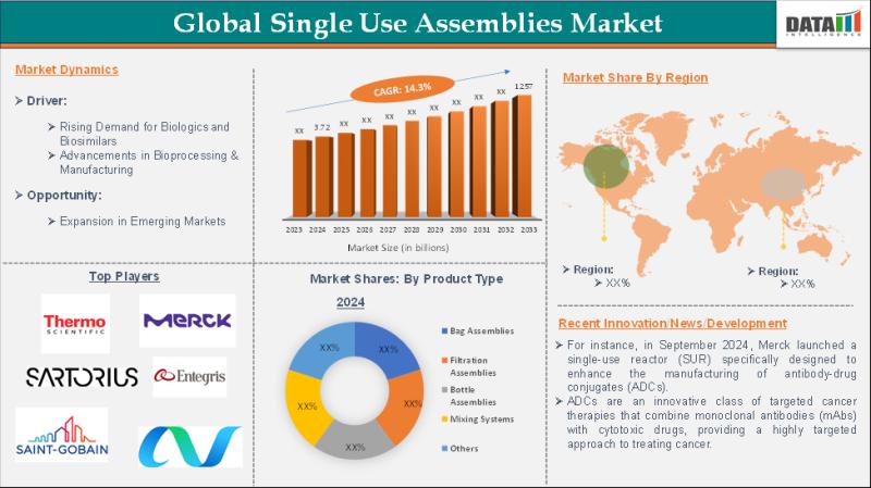 single-use assemblies market reached US$ 3.72 billion in 2024 and is expected to reach US$ 12.57 billion by 2033, growing at a CAGR of 14.3% during the forecast period of 2025-2033.DataM Intelligence has published a new research report on "single-use Assemblies Market Size 2025". The report explores comprehensive and insightful Information about various key factors like Regional Growth, Segmentation, CAGR, Business Revenue Status of Top Key Players and Drivers. The purpose of this report is to provide a telescopic view of the current market size by value and volume, opportunities, and development status.